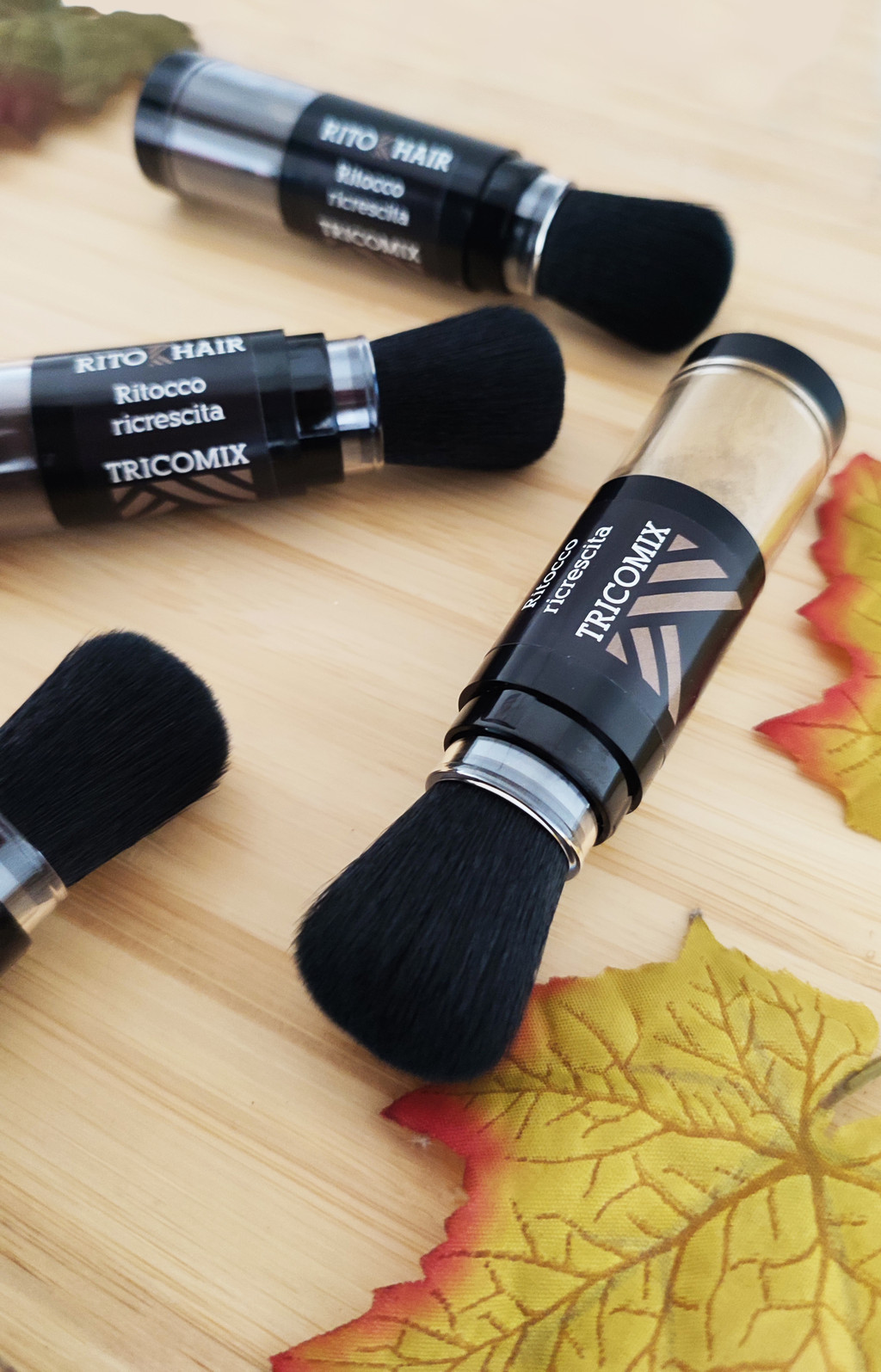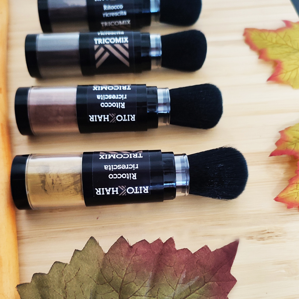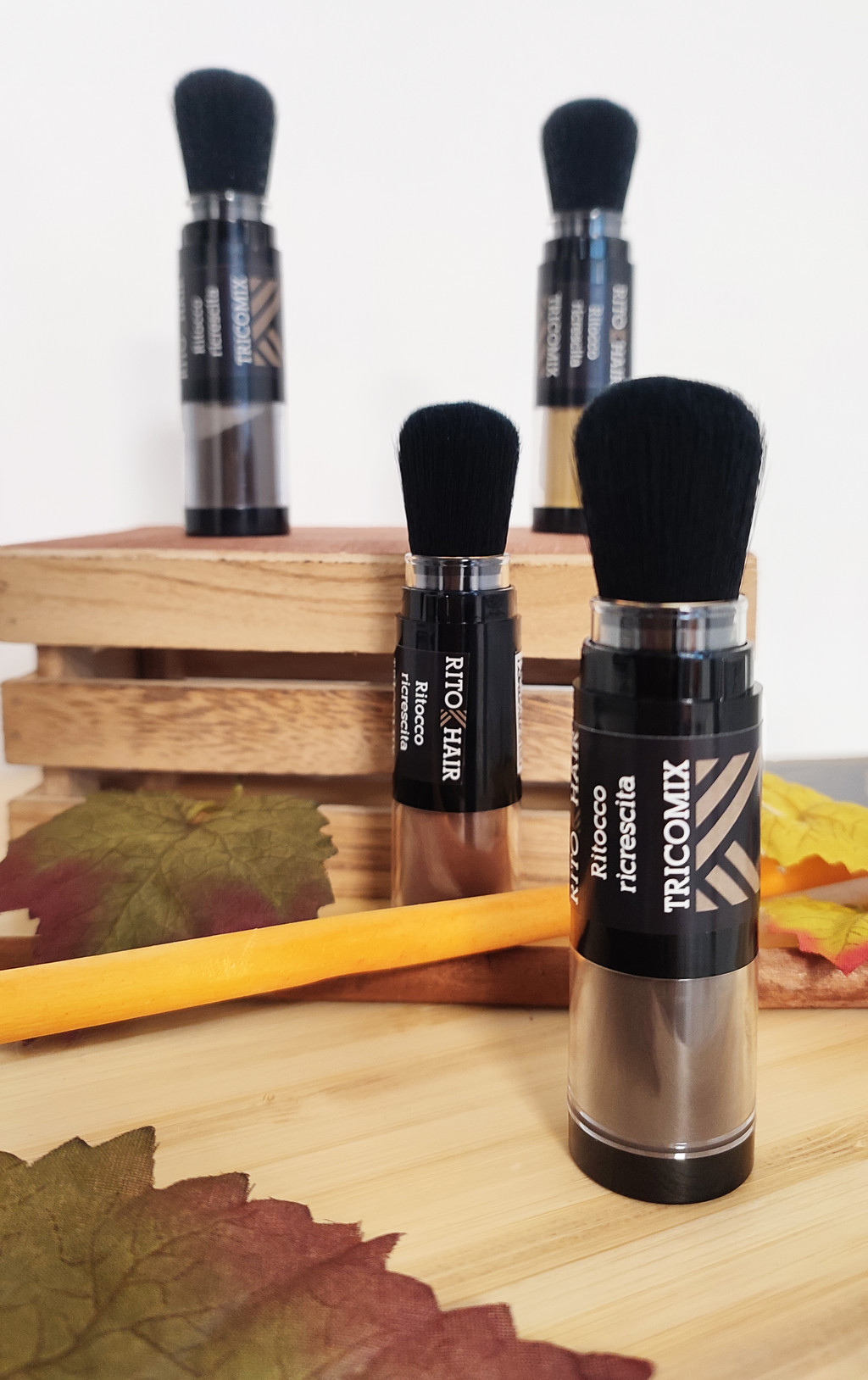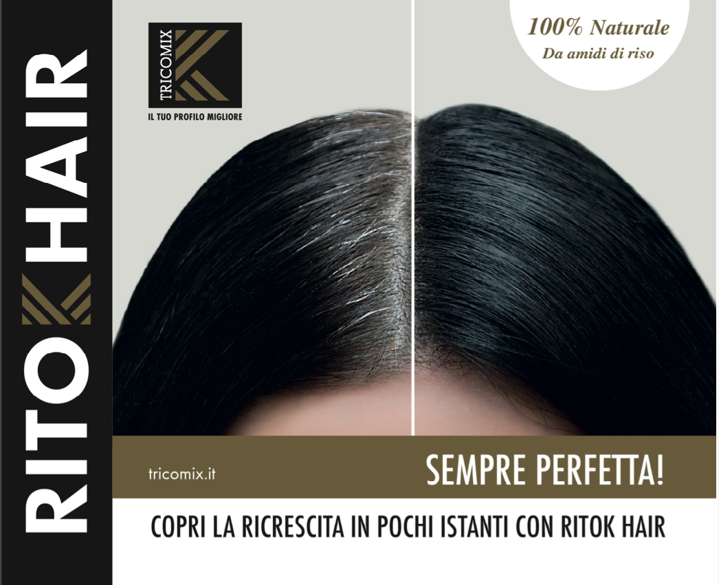 Ritok Hair della linea Tricomix in quattro colorazioni differenti permette di coprire “la ricrescita” dei capelli bianchi con azione istantanea e non permanente, facilmente stendibile e modulabile, aderisce perfettamente al capello.